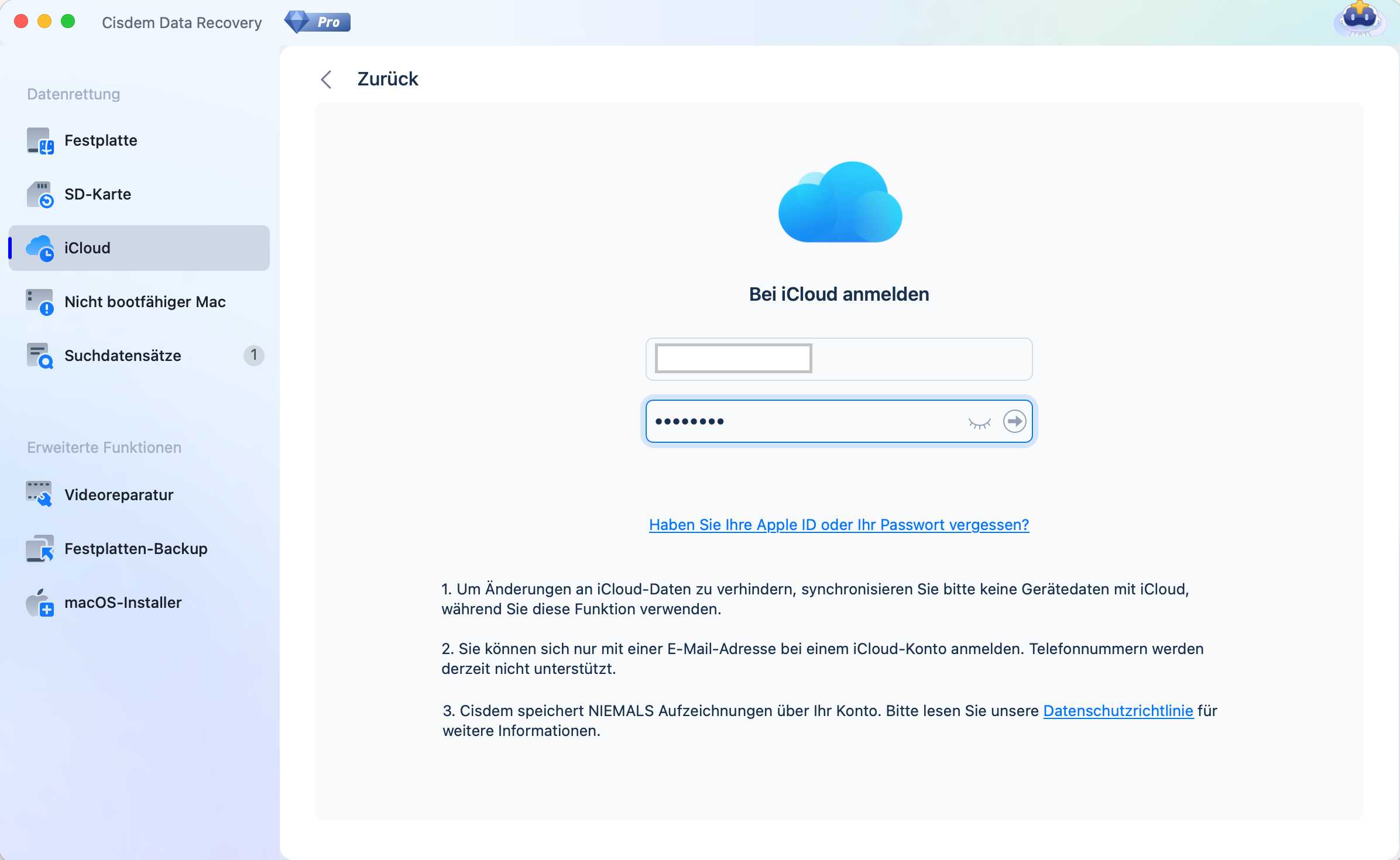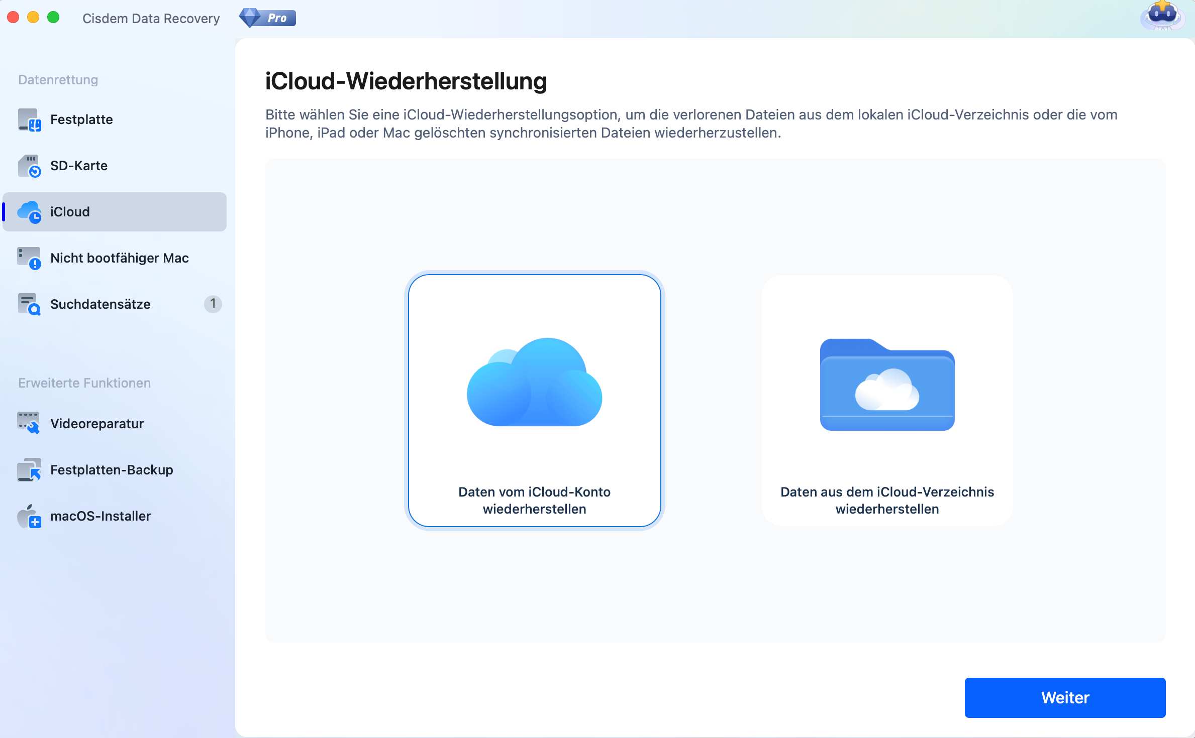 - Tippen Sie auf iCloud > Daten vom iCloud-Konto wiederherstellen > Weiter.