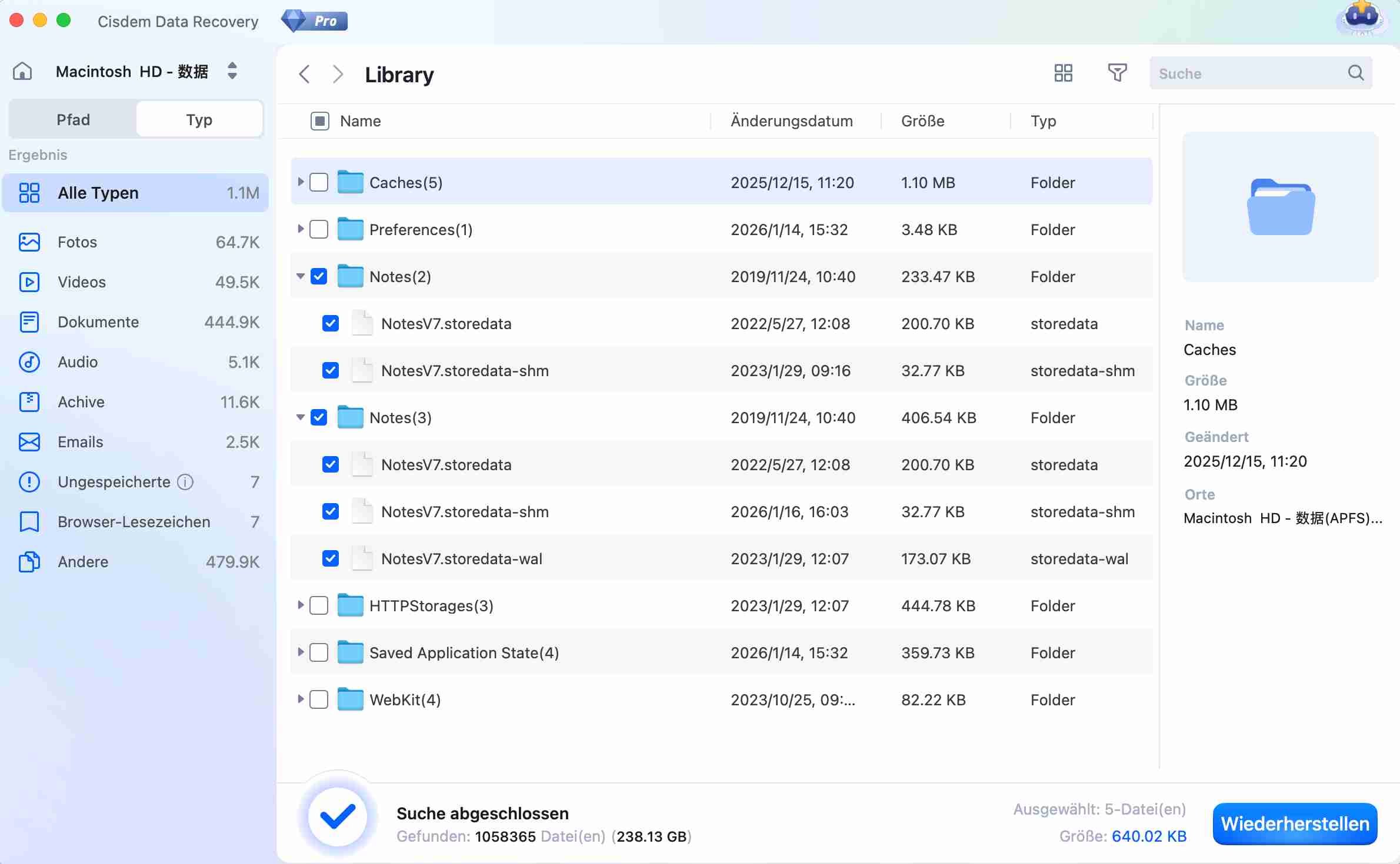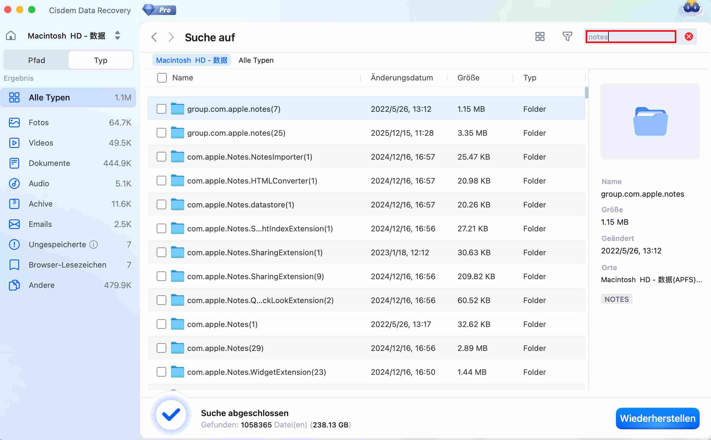 Gehen Sie dann zu Typ, geben notes in das Suchfeld ein, um alle wiederherstellende Notizen zu finden. Die verschwundenen Notizen werden in dem Unterordner Data von com.apple.Notes gespeichert.![]()
