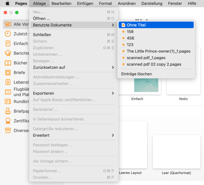 - Wählen Sie im oberen Menü „Ablage“ > „Benutzte Dokumente“. Dann werden mehrere Pages-Dateien angezeigt, an denen Sie gearbeitet haben.