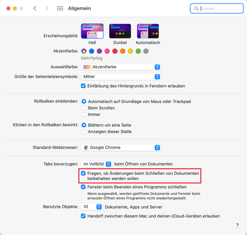 - Deaktivieren Sie das Kästchen vor „Fragen, ob Änderungen beim Schließen von Dokumenten beibehalten werden sollen“. Dann ist das automatische Speichern eingeschaltet.