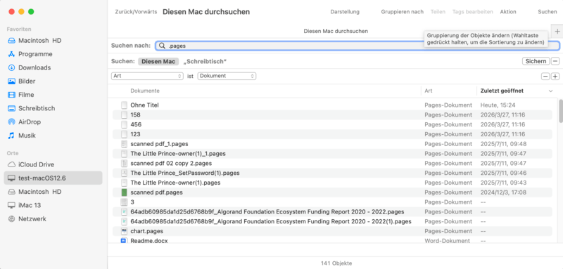 - Gehen Sie zu „Typ“ > „Dokumente“ > „Pages“ und alle gefundenen Pages-Dokumente werden angezeigt. Filter- und Suchfunktionen stehen auch hier zur Verfügung.