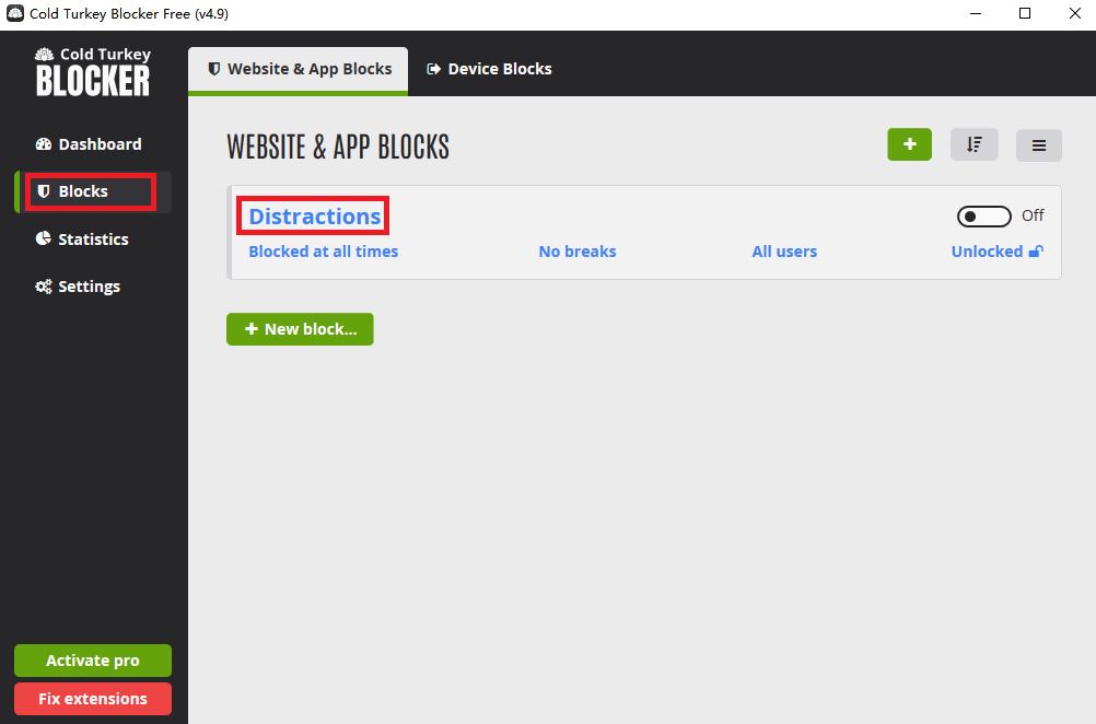 3. Klicken Sie danach auf Blocks auf der linken Seitenleiste, tippen auf den Namen Distractions.