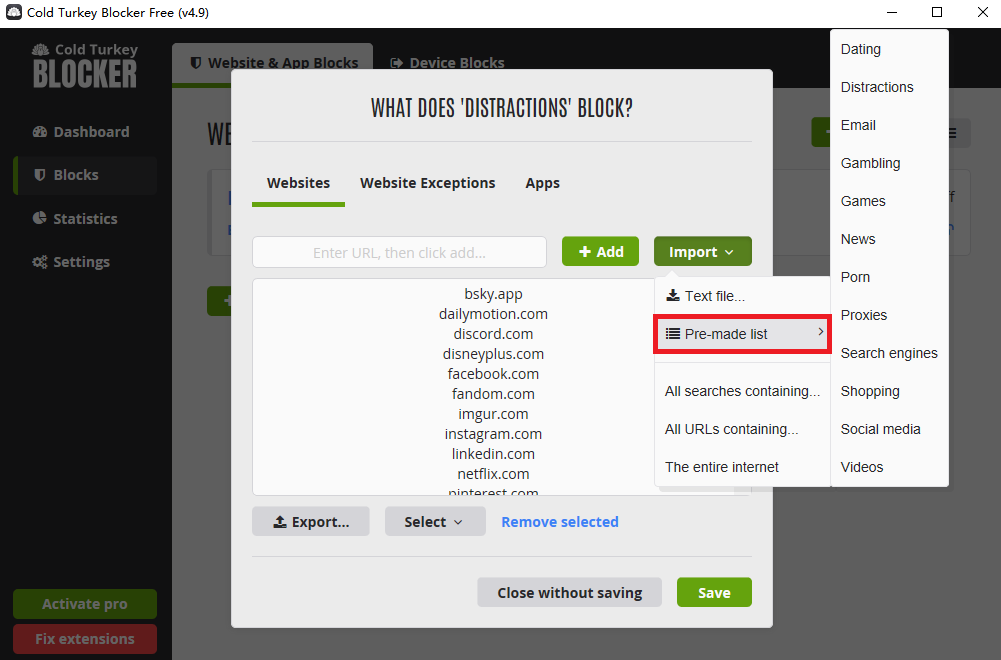 6. Fügen Sie die URL der Website hinzu, die Sie blockieren möchten, und fügen Sie weitere ablenkende Websites zur Blockierliste hinzu. Oder importieren Sie eine Kategorie von zu blockierenden Websites.