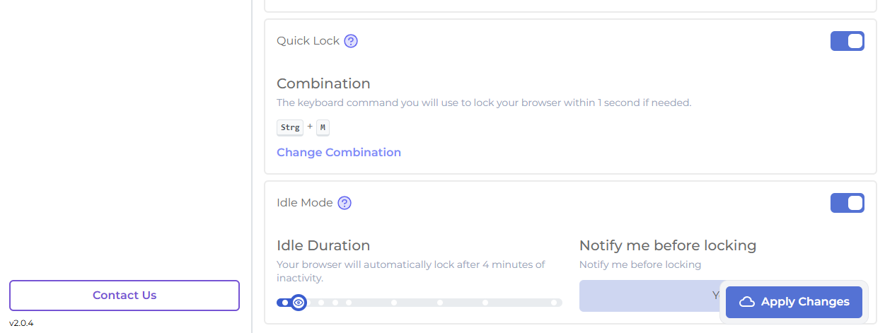- Aktivieren Sie Browser Lock, Auto Lock, Quarantine Mode, Quick Lock und Idle Mode. Legen Sie dabei die entsprechenden Einstellungen fest: die maximale Anzahl der Versuche sowie die Inaktivitätsdauer in Minuten, nach deren Ablauf diese Erweiterung den Chrome-Browser automatisch sperrt.