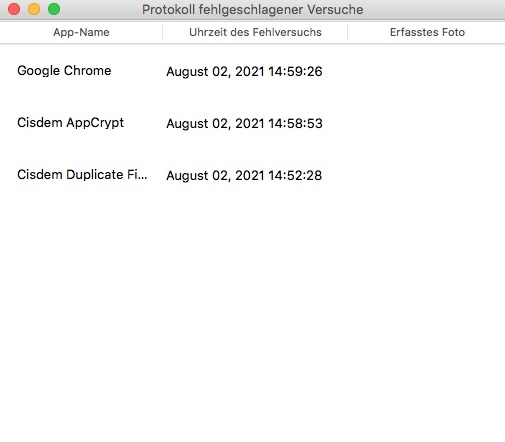 - Zeichnet fehlgeschlagene Versuche auf, gesperrte Anwendungen zu öffnen, und zeigt Datum, Uhrzeit und das Foto des Eindringlings an