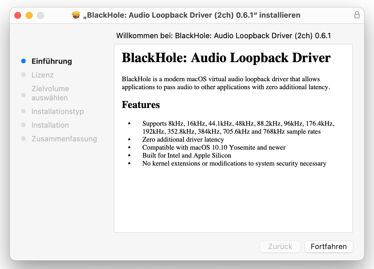 Dieses Tool BlackHole läuft grundsätzlich auf allen mordernen Macs (Intel + Apple Silicon). Um es problemlos auf Ihrem Mac auszuführen, installieren Sie aktuelle Version von BlackHole.