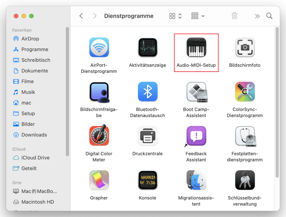 - Gehen Sie zu „Programme > Dienstprogramme > Audio-MIDI-Setup“ und öffnen die vorinstallierte Mac-App.