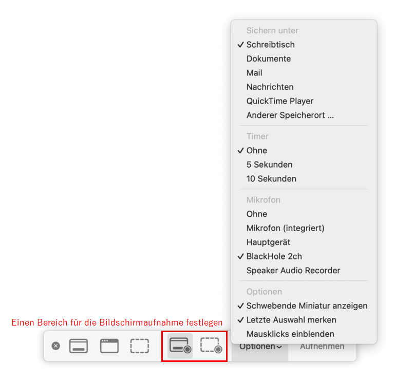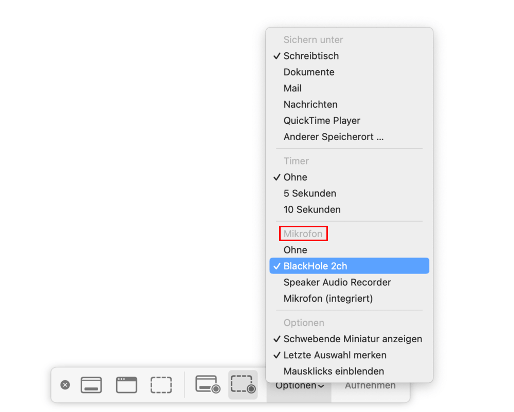 - In QuickTime Player oder bei Shift + Cmd + 5 wählen Sie unter „Mikrofon“ BlackHole 2ch aus.