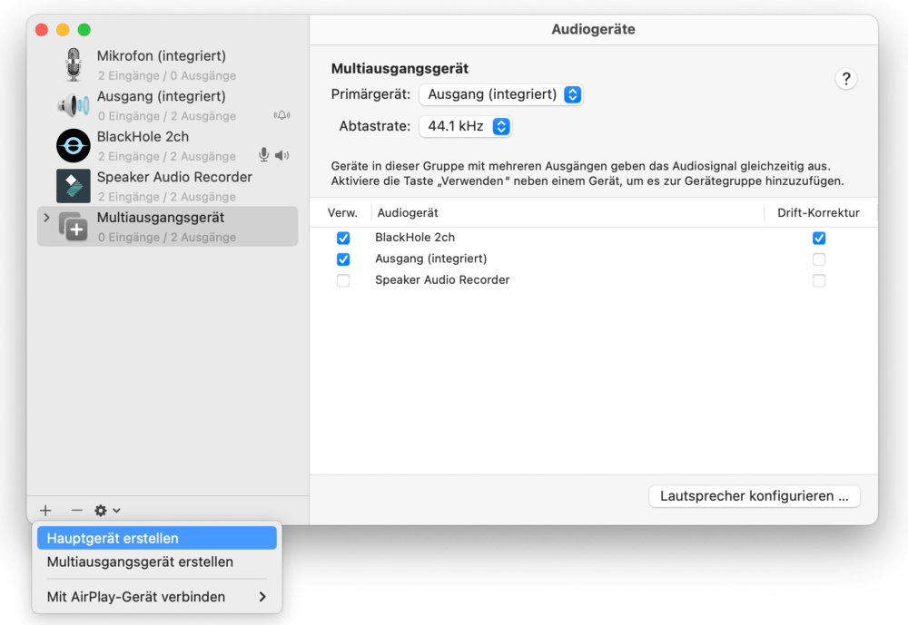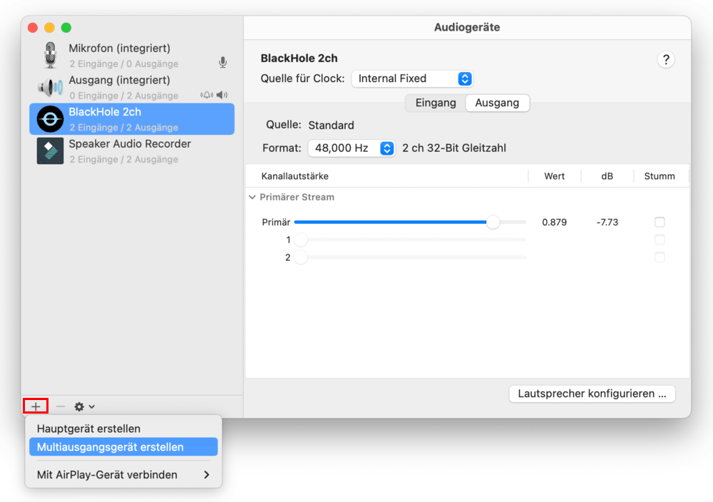 - Klicken Sie unten links auf „+“ und wählen „Multiausgangsgerät erstellen“.
