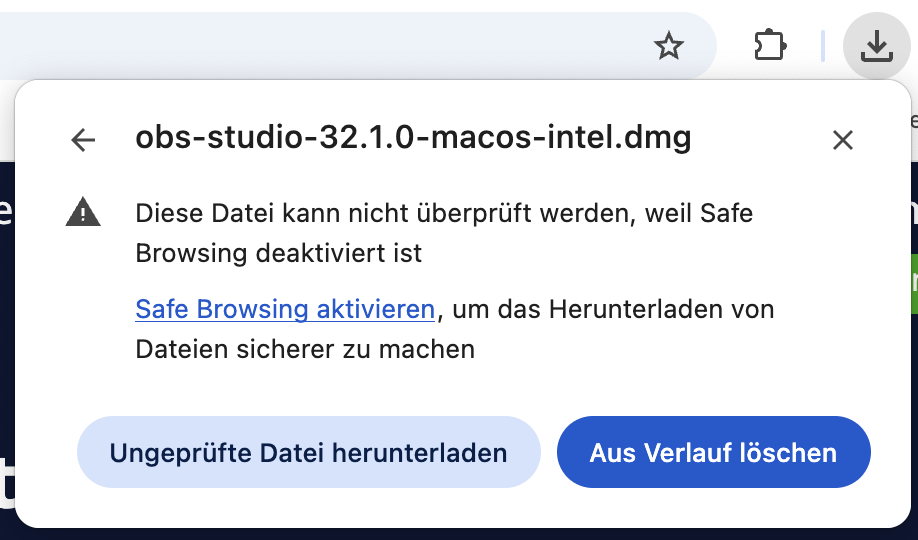 Hinweis: Ein Fenster wird beim Download angezeigt, wenn Safe Browsing in Google Chrome deaktiviert ist. In diesem Fall klicken Sie direkt auf „Ungeprüfte Datei herunterladen“ oder aktivieren Safe Browsing.![]()