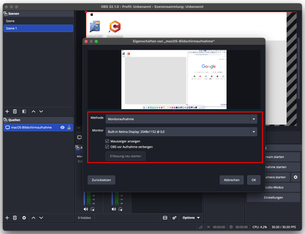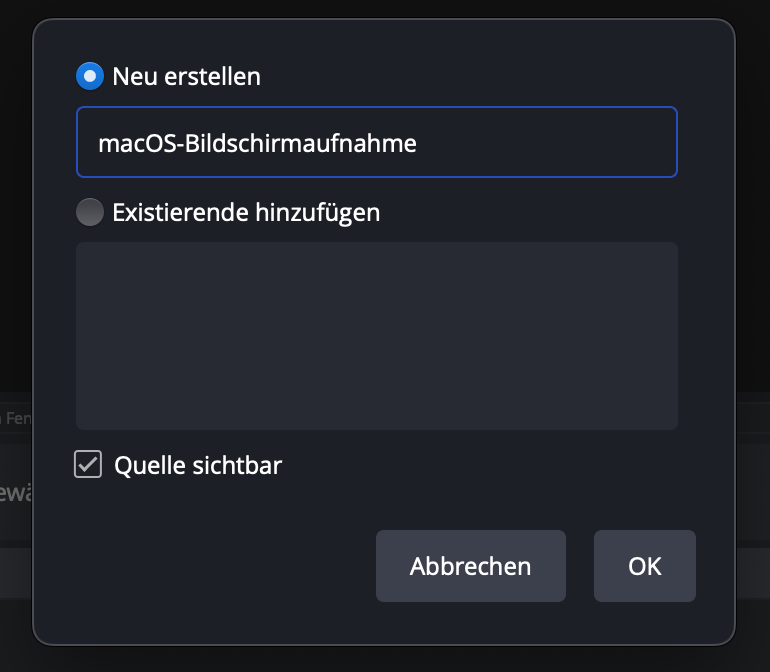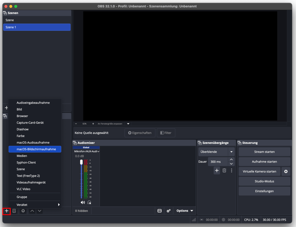- Unter dem Bereich Quellen klicken Sie auf „+“ und wählen „macOS-Bildschirmaufnahme“ aus.