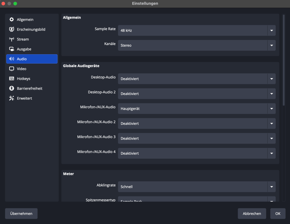 Hinweis: In OBS gibt es mehrere Slots („Mikrofon-/AUX-Audio 1, 2, 3…“). In diesem Szenario nutzen Sie nur eine „Mikrofon-/AUX-Audio“-Quelle als Hauptgerät und das „Hauptgerät“ kombiniert bereits Mikrofon (Ihre Stimme) und Systemaudio (über BlackHole), deshalb brauchen Sie nur einen davon aktiv. Ein zweiter Audio-Slot wäre doppelt oder störend (Echo / doppelte Aufnahme).