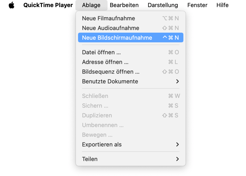 - Klicken Sie auf „Ablage > Neue Bildschirmaufnahme“.