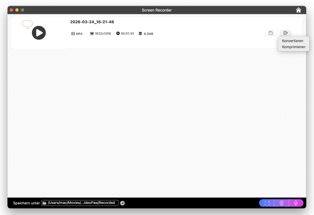 - Das gerade aufgezeichnete Video kann abgespielt, in ein anderes Format konvertiert oder komprimiert werden. Mit einem Klick auf das Ordner-Symbol wird der Speicherordner direkt geöffnet.