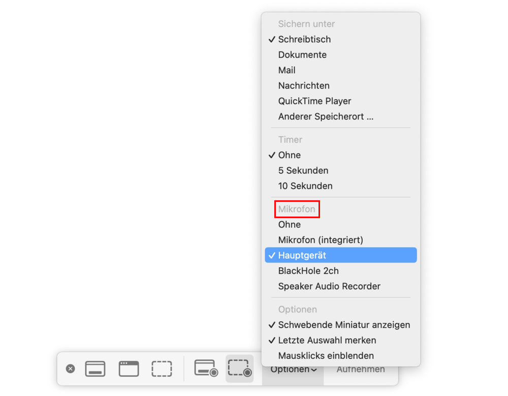 - Bei Shift + Cmd + 5 und im QuickTime Player wählen Sie bei „Mikrofon“ das Hauptgerät aus.