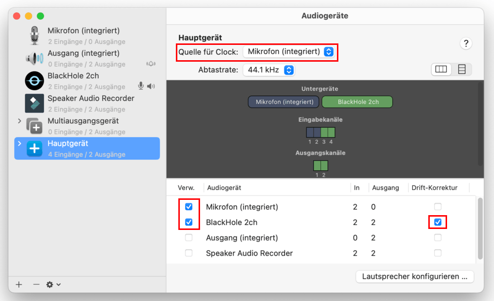 - Wählen Sie „Mikrofon (integriert)“ als „Quelle für Clock“ und aktivieren Sie Drift-Korrektur für BlackHole 2ch.