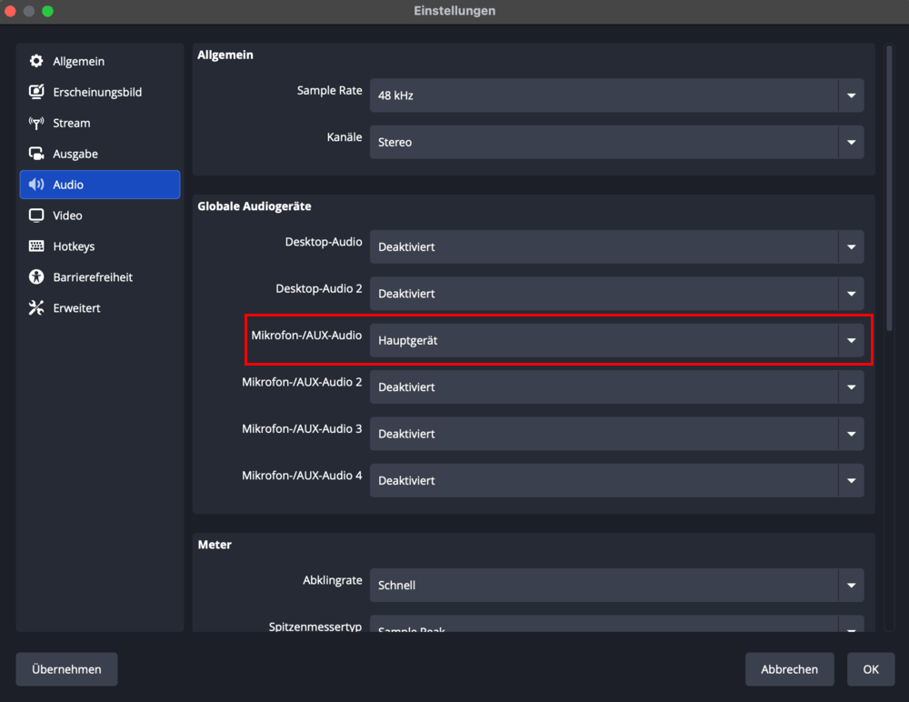 - In Apps wie OBS Studio wählen Sie Hauptgerät als „Mikrofon-/AUX-Audio“ und deaktivieren Sie „Desktop-Audio“.