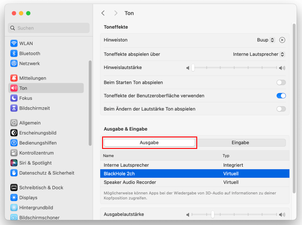 Hinweis: Aller Systemton wird jetzt in BlackHole geleitet und Sie hören erstmal nichts.