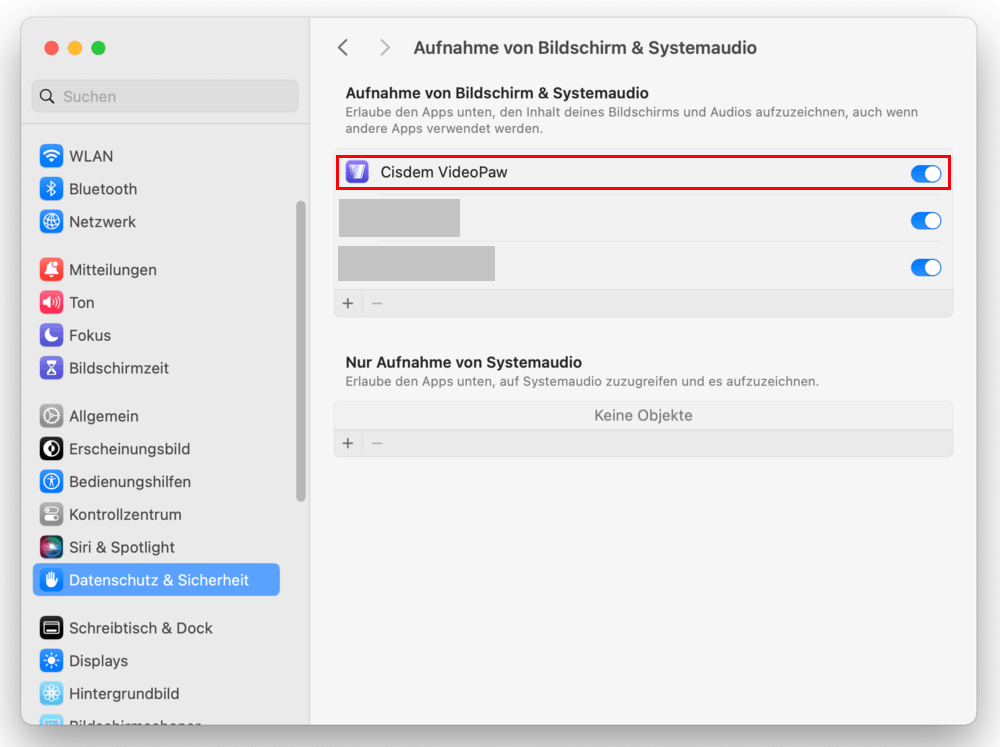 Kostenlos Laden macOS 10.15 oder höher - Gehen Sie zu „Systemeinstellungen > Datenschutz & Sicherheit“ und erteilen Sie anschließend die Berechtigungen für „Aufnahme von Bildschirm & Systemaudio“.