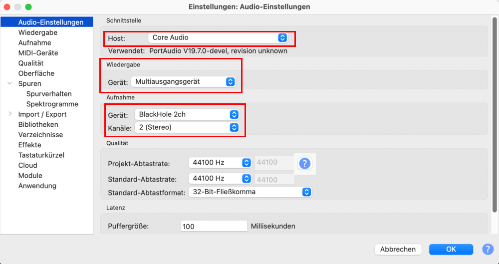 - Audacity: die Mac-Version von Audacity benötigt ein Zusatztool wie BlackHole; verschiedene Qualitätsoptionen bieten