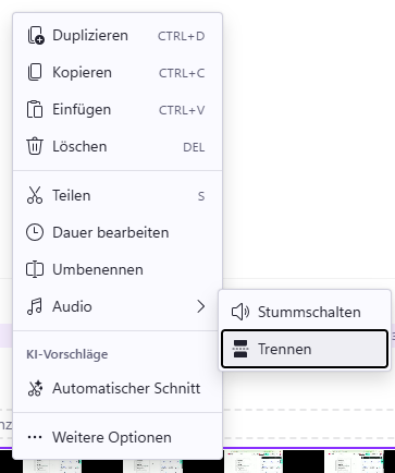 - Klicken Sie mit der rechten Maustaste auf das Video in der Timeline und wählen „Audio > Trennen“.