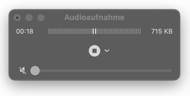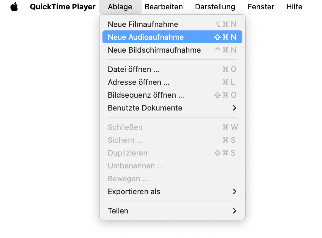 - Sarten Sie die App QuickTime Player und wählen „Ablage > Neue Audioaufnahme“.