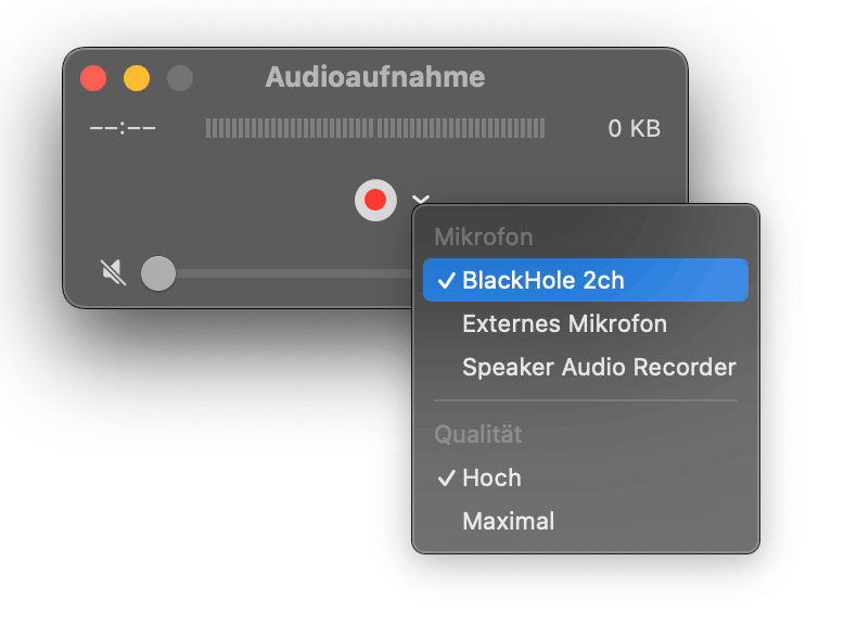 - Öffnen Sie das Dropdown-Menü neben dem roten Aufnahmeknopf und wählen Sie „BlackHole 2ch“ als Mikrofon und eine Qualitätsoption aus.