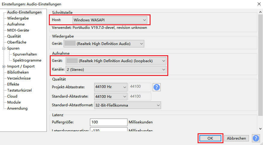 - Wählen Sie unter Aufnahme Ihren aktuellen Lautsprecher oder Kopfhörer aus, der mit dem Zusatz (loopback) versehen ist (z. B. Speakers (Realtek Audio) (loopback)).