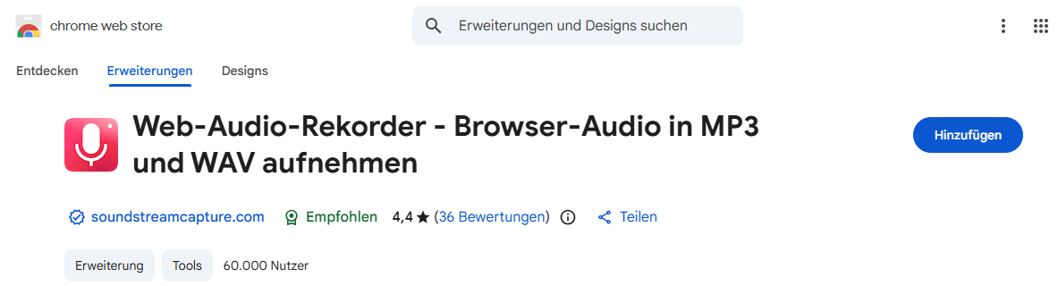 - die Erweiterung Web-Audio-Rekorder: einfache Nutzung direkt im Browser, keine komplexe Einrichtung