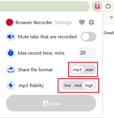 Die Erweiterung Web-Audio-Rekorder (verfügbar für Chrome und Edge) kann YouTube-Audio kostenlos als MP3 oder WAV aufnehmen und bietet drei Qualitätsstufen: niedrig (96 kbps), mittel (192 kbps) und hoch (320kbps).
