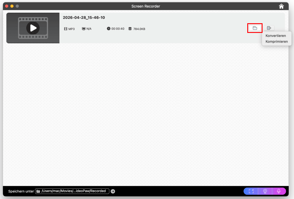 - Die Audioaufnahme wird in der Liste angezeigt. Klicken Sie auf das Ordnersymbol, um die Datei schnell im Speicherordner zu finden.