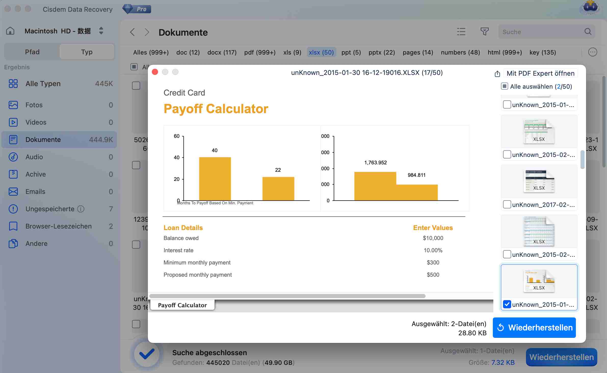 Um eine nicht gespeicherte Excel-Datei auf dem Mac wiederherzustellen, ist die Autowiederherstellungsfunktion von MS Office Excel selbst die beste Wahl. Sollte dies nicht funktionieren, benötigen Sie eine professionelle Datenrettungssoftware, um alle Versionen der Excel-Datei ausfindig zu machen und dann bei Bedarf wiederherzustellen. Wenn Sie eine gelöschte Excel-Datei auf dem Mac wiederherstellen möchten, sollten Sie unbedingt auch Cisdem ausprobieren.