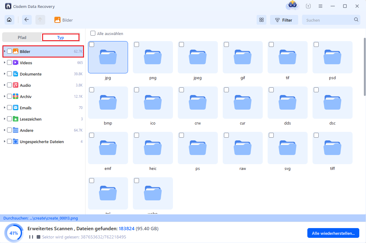 --- Nach dem Scan wird das Ergebnis auf der linken Seite nach verschiedenen Dateikategorien angezeigt.