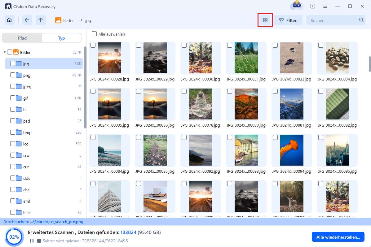 - Zeigt gefundene Fotos vor der Wiederherstellung im Vorschaufenster an