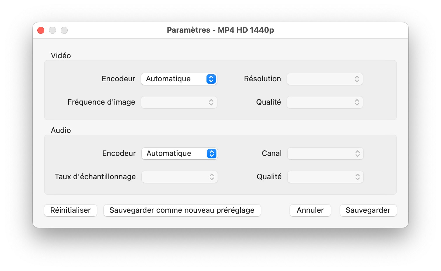 - Paramètres avancés pour modifier le codec du fichier de sortie, la qualité, le débit binaire, etc.