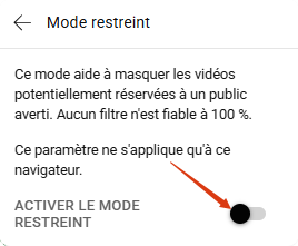 Le mode restreint aide à filtrer les chaînes et les vidéos susceptibles d'être réservées à un public averti dans vos résultats. Une fois activé, il fonctionne automatiquement.