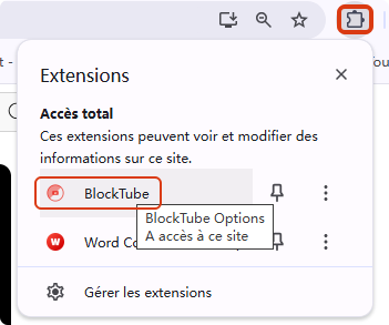 - Si vous voulez ne plus bloquer la vidéo ou la chaîne, trouvez l’extension dans la barre de menu supérieur, appuyez sur « BlockTube ».