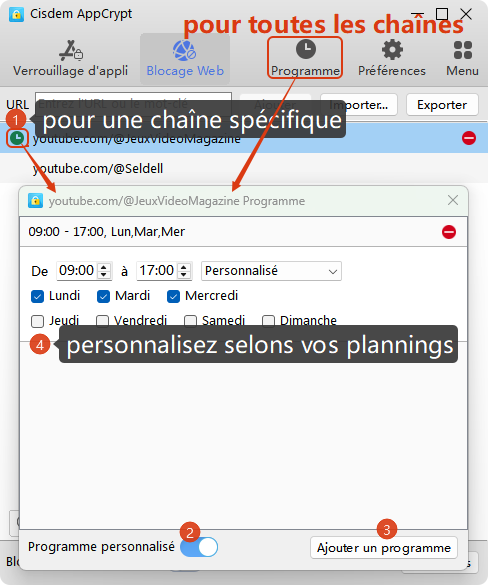 - Mais vous ne pouvez bloquer une certaine chaîne pendant certaines heures par mot de passe comme dans Cisdem AppCrypt.
