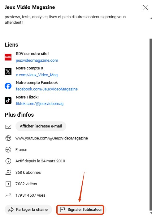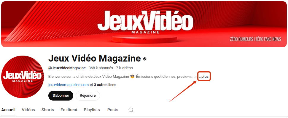 - Accédez à l’accueil de la chaîne vous voulez ne plus jamais voir sur YouTube. Cliquez sur « ...plus » dans la description.