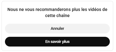 - Vous verrez alors apparaître un message indiquant qu’il ne recommandera plus les vidéos de cette chaîne. Il offre également un bouton d'annulation.
