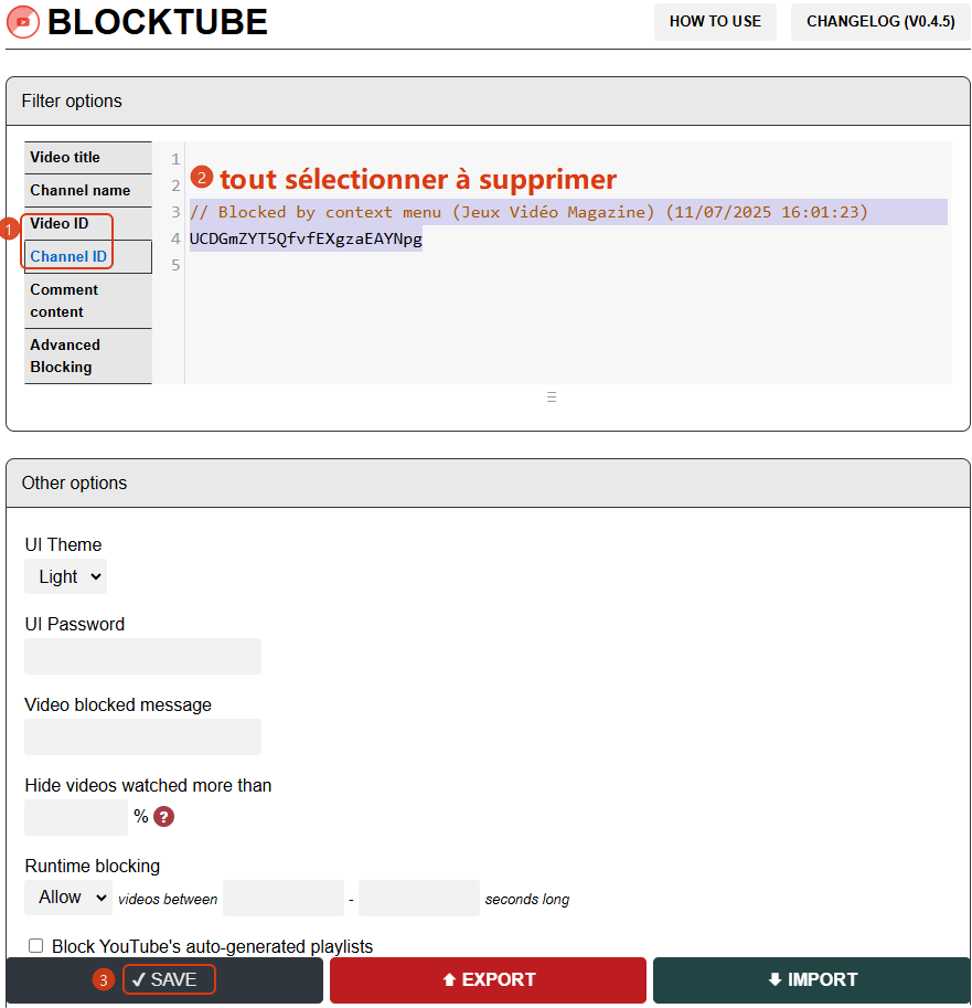 - Dans l’option « Video ID » ou « Channel ID », supprimer l’identité vous voulez récupérer, et enfin cliquez sur « Save » en bas pour enregistrer le changement.