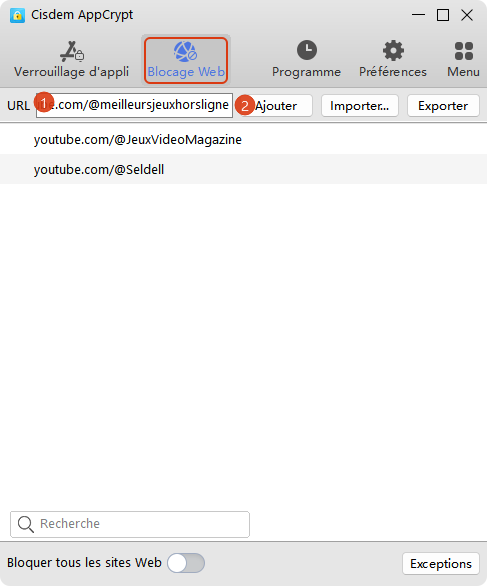 4. Ouvrez l'onglet « Blocage Web ». Copiez et collez l'URL d'une chaîne YouTube et cliquez sur le bouton « Ajouter ».
