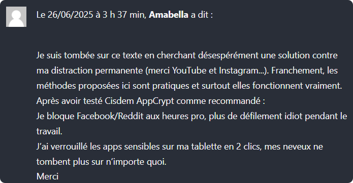 Par exemple, une étudiente appelé Amabella cherchait désespérement une solution contre la distraction permanente de YouTube et Instagram. Puis elle est tombée sur un article qui présentait Cisdem AppCrypt et l’a essayé. Enfin elle a bloqué les réseaux sociaux aux heures spécifiques et simplement verrouillé des applis par mot de passe pour augmenter sa productivité pendant le travail.