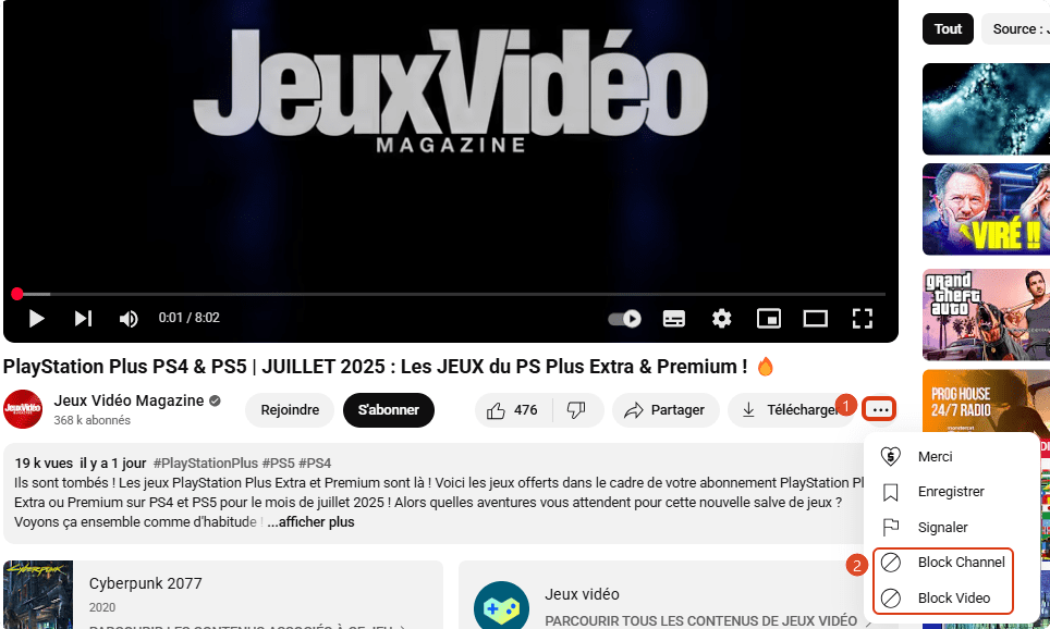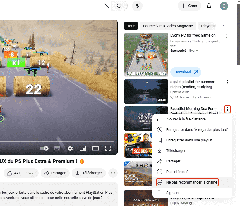 - Sur ordinateur, trouvez la vidéo de la chaîne que vous voulez bloquer à droite, et suivez les étapes même que sur téléphone.