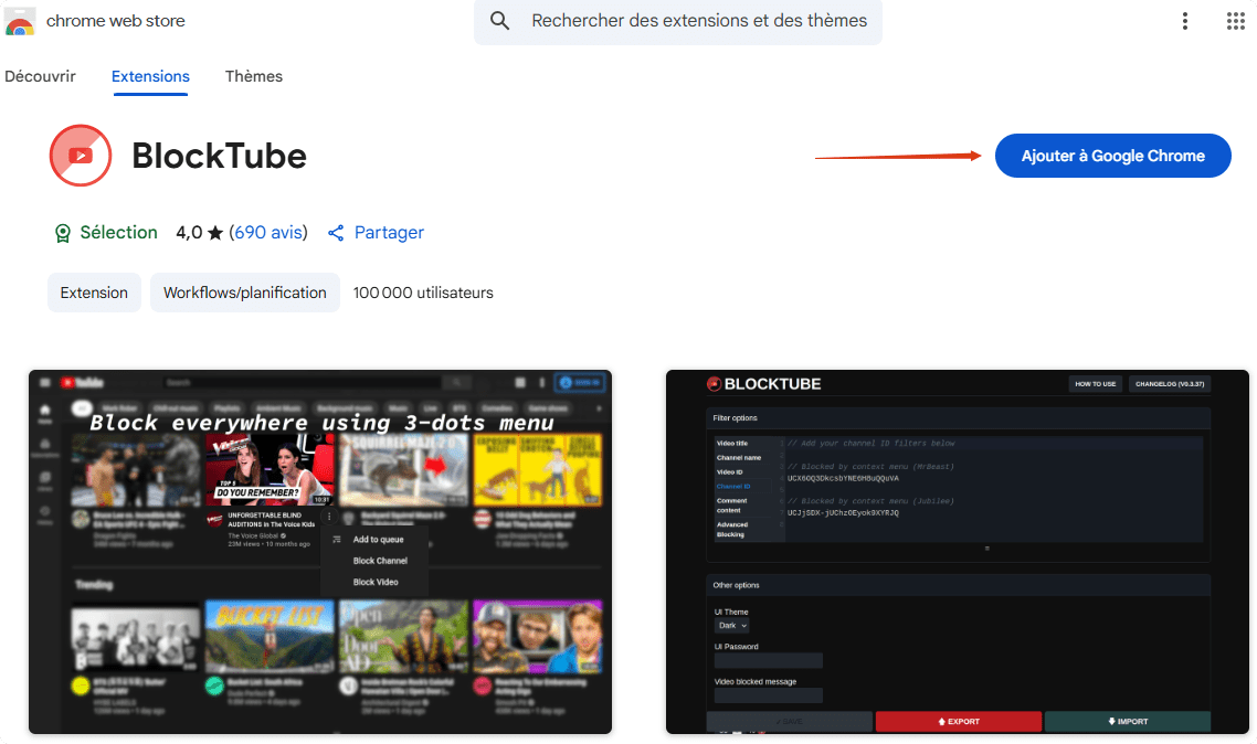 Il existe différentes extensions disponibles pour divers navigateurs Web. Ici, je vais vous présenter BlockTube. Disponible sur Google Chrome et Firefox, cet outil fonctionne simplement mais pratiquement, et sans connection.