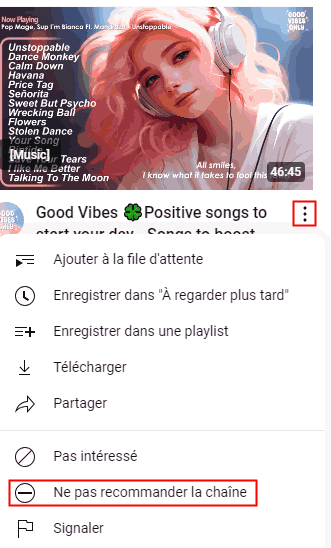 - Ouvrez la video d’une chaîne que vous voulez ne plus voir.