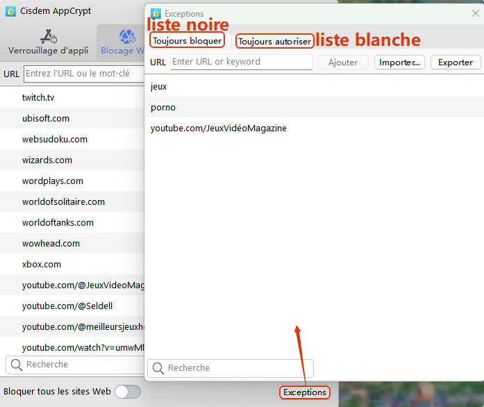 - Comme vous pouvez le constater, il existe un bouton « Exceptions » en bas. Cliquez en dessus et vous trouverez deux stratégies : la Liste noire (blocage ciblé) et la Liste blanche (autorisation exclusive). Profitez de ces fonctionnalités pour mieux bloquer utilisateur youtube vous ne plus voir.