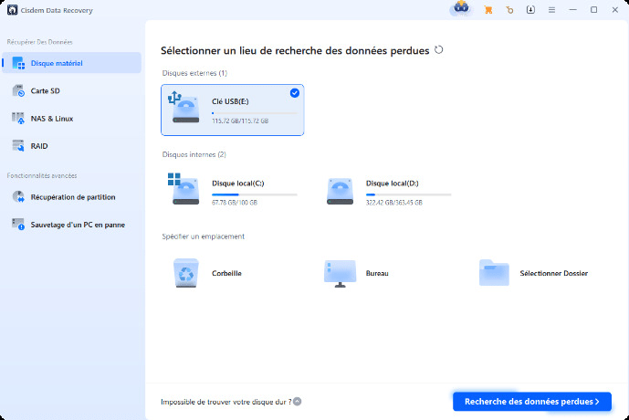 Cisdem Data Recovery est un tel outil pour récupérer photos, vidéos, documents et d’autres fichiers sur disque dur interne/externe, clé USB, carte SD, caméra digital, etc. Sa fonction d’analyse trouvera tous les fichiers supprimés et perdus.