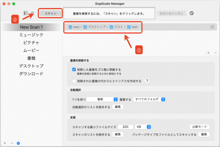 - 設定完了後、メイン画面に戻り、ドラッグ&ドロップで検索するフォルダを追加し、「スキャン」を押します。