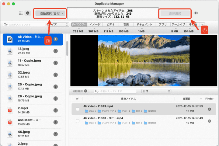 - 重複ファイルを自動的に選択して、1クリックで一括削除する
